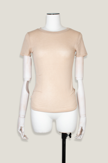 窮屈さを感じさせないほどのストレッチの柔らかさがまるでセカンドスキンの様に着心地のいいニット素材のTシャツ。キャミソールやベアトップとの重ね着用に、微かに透ける素材を活かしブラトップを見せてなど、レイヤーアイテムとして最適です