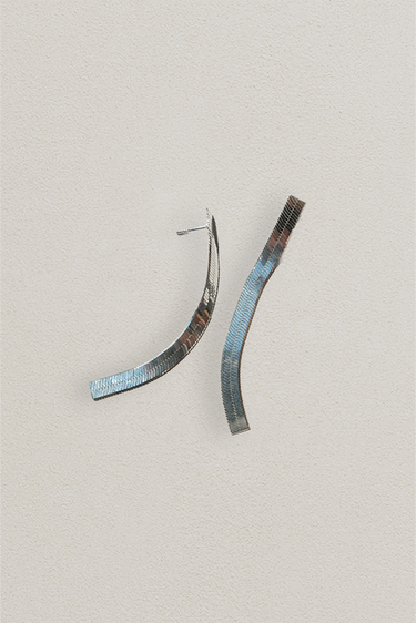 平なチェーンが幾何学的なパターンと共にスッと下に伸び、滑らかな動きを見せる美しいピアス。