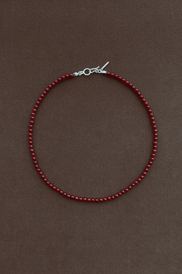 深みのあるカーネリアンの赤が上品に煌めき、ベースコードにシルク100%を使用することにより肌に優しく馴染み、浮きなくしなやかにフィットします