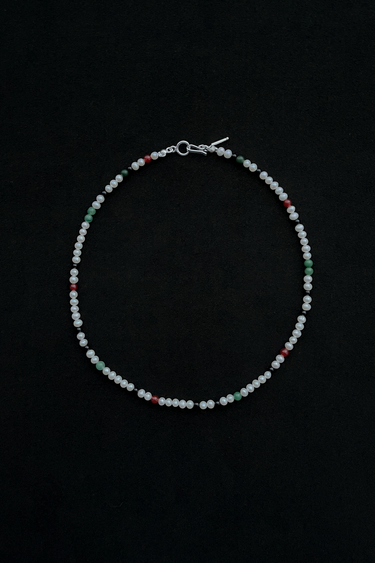 色. 形. 輝きともに美しい天然淡水パールは AAAグレードを使用。程よい存在感のある4mmサイズをベースに、天然のカーネリアン、オニキス、ジェイドを散りばめたネックレス。スターリングシルバー(SV925)の留め具で仕上げています。一点一点を丁寧に、日本でハンドクラフトにより製作された特別なアイテムです